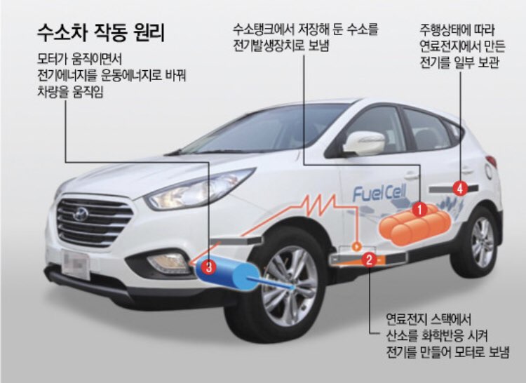 기존 가솔린 내연기관 대신 연료전지(수소와 공기중의 산소를 반응시키고 이때 발생하는 전기)를 이용한 차세대 친환경차로 수소와 산소가 결합해 에너지를 만든 후 이산화탄소 등의 산화수소물이 아닌H2O(물)가 배출되게 하는 차입니다.